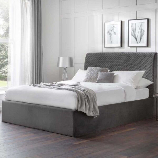 The Capehart ottoman is an elegant, luxurious bed which features a tall, plush headboard entwined with an exquisite diamond stitch design. Finished in a beautiful grey velvet with black metal legs.