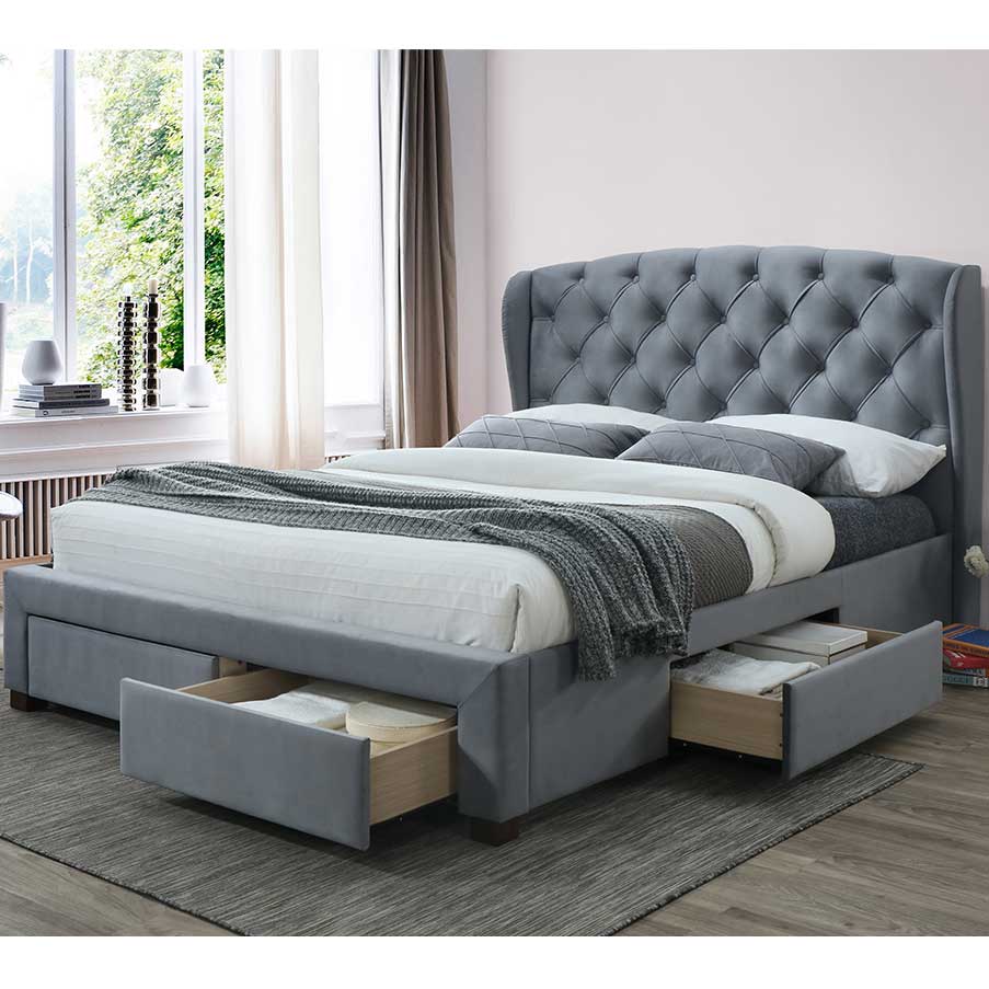 Make a grand statement with this elegant and contemporary Loxwood bed frame. Featuring a stylish wingback headboard with tufted detailing and 4 large storage drawers in the base.