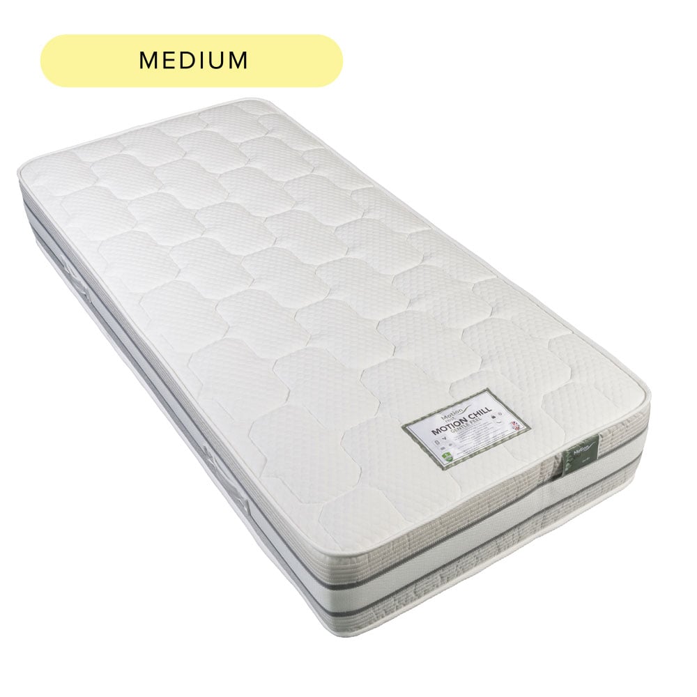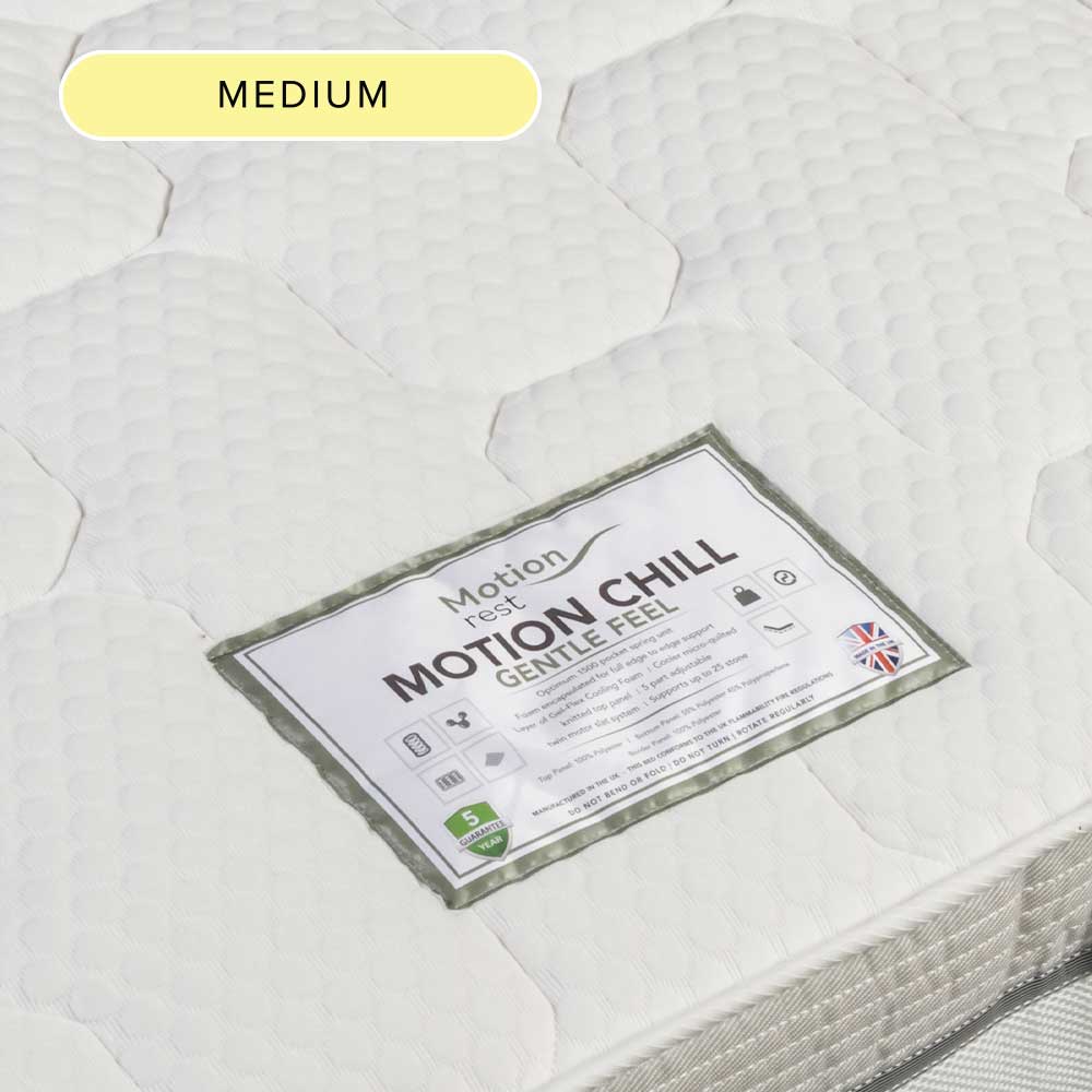 The Motion Chill mattress has a combination of pocket springs with a Micro Quilted top surface to gently support you and conform to the position of the adjustable base. Gel-Flex Cooling Foam helps regulate body temperature, the mattress is a medium comfort.