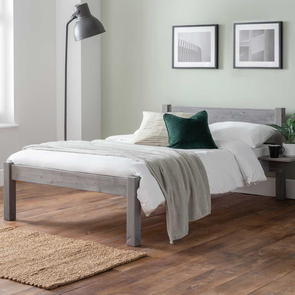 The Brooksby bed frame is crafted from Scandinavian redwood, a high quality slow growing pine that is dense and sturdy. This popular frame combines a simple style with the versatility to suit any style bedroom. Frame shown in a Georgian grey finish.