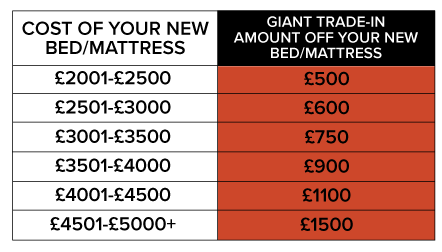 With our Trade-In Sale, you can save up to £1500 on a brand-new bed or mattress when you trade in your old one.